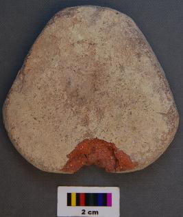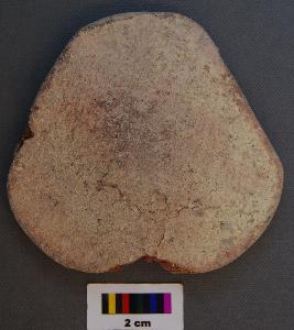 | Description / विवरण | It is a triangular terracotta cake with round corners, uneven thickness and one of the arms is patrially broken in the cental part. |