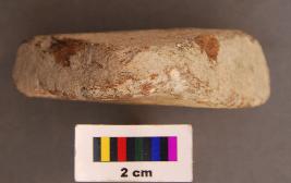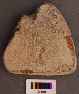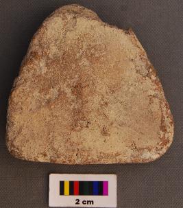 | Description / विवरण | It is a triangular terracotta cake with blunt corners, uneven thickness and patrially broken at one of the corners. |