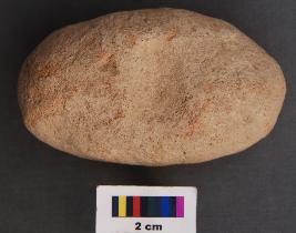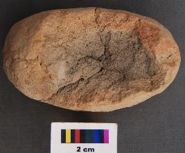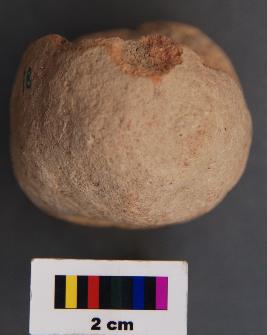 | Description / विवरण | It is an oval shaped terracotta cake with thick body and a prominent depression on the dorsal side. It is half broken and a crack is also developed on the body. |