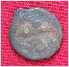 | Description / विवरण | The coin is circular in shape. Obverse- Kushana type king standing with his right hand curved upwards and the left arm extended. Reverse- probably the figure of Mao or Moon God with right arm curved upwards and the crescent above the left shoulder. |
