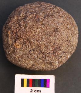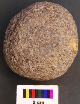 | Description / विवरण | It is spherical stone ball with partially flattened and polished surface. It may have been used as hammer cum muller. Its surface is granular. |