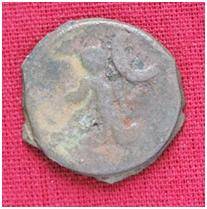| Description / विवरण | The coin is circular in shape. Obverse- probably the figure of Mao or Moon God with right arm curved upwards and the crescent above the left shoulder. Reverse-Three hills or cone like object placed in a straight line and below them there is an inscription. |