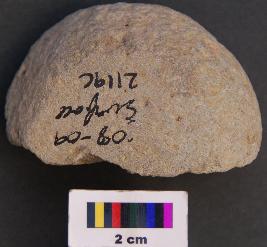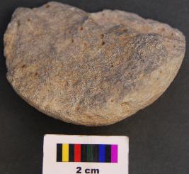 | Description / विवरण | It is fragmentof a muller with partially flattened and well polished surface. It has batter marks also. |