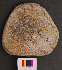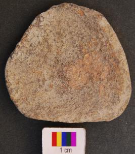 | Description / विवरण | It is a small triangular terracotta cake with blunt corners and equal arms. Its entire body part is missing from one side |