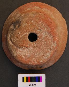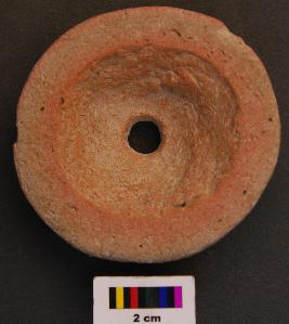 | Description / विवरण | It is a terracotta lamp like object with perforation at the base. Its rim appears to be grind on top. It seems to be made out of a base fragment of a pot jar as its thick section would indicate. |