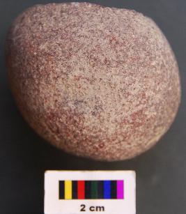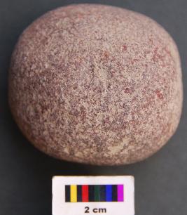 | Description / विवरण | It is a stone ball, partially broken on the surface. It has batter marks indicating that it may have been used as a hammer. |