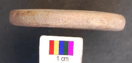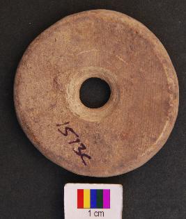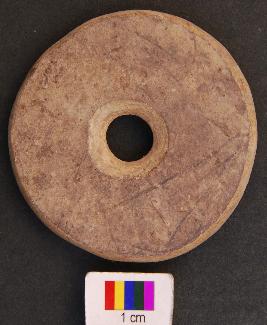 | Description / विवरण | It is circular terracotta disc with a perforation in the central part. Its edges as well as perforation are grind. The perforation has a damru shaped section. Therefore, perhaps it was used as net sinker. |