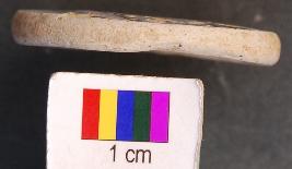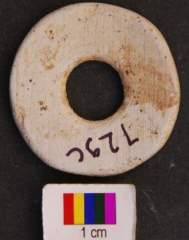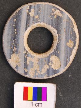 | Description / विवरण | It is circular terracotta disc with a larget perforation in the central part. Its edges as well as perforation are grind. The perforation has a damru shaped section. It was perhaps used as a net sinker. |