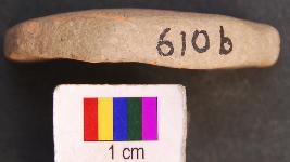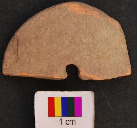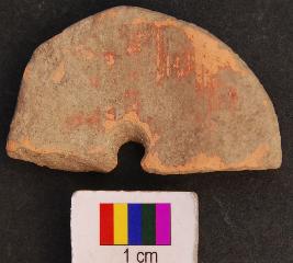 | Description / विवरण | It is circular terracotta disc with a perforation in the central part. Its half portion is missing. |