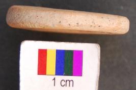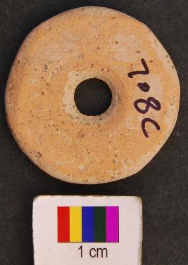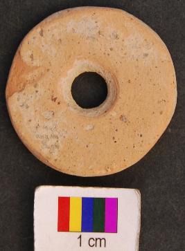 | Description / विवरण | It is circular terracotta disc with a perforation in the central part. Its edges as well as perforation are grind. The perforation has a damru shaped profile. Perhaps it was used as a net sinker. It has thin section. |