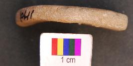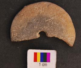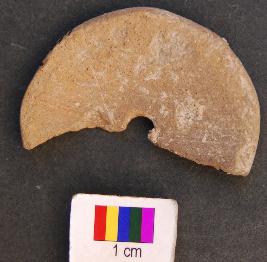 | Description / विवरण | It is circular terracotta disc with a perforation in the central part. Its almost half portion is missing. |
