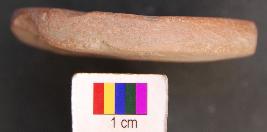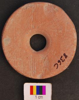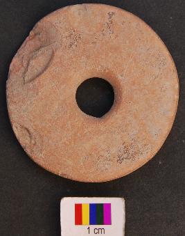 | Description / विवरण | It is terracotta disc with a perforation in the central part. Its edges as well as perforation are grind. The perforation has a damru shaped section. Therefore perhaps it was used as net sinker. It is partially broken on the edge. |