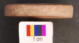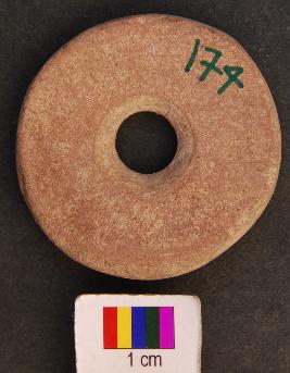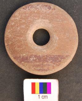 | Description / विवरण | It is terracotta disc with a perforation in the central part. Its edges as well as perforation are grind. The perforation has a damru shaped section. Perhaps it was used as a net sinker. |