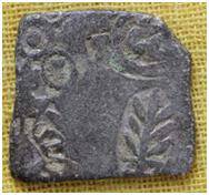 | Description / विवरण | The shape of the coin is irregular. Obverse Sun, tree, six armed wheel and an indistinct symbol. Reverse Dot within circle flanked by two taurines. |