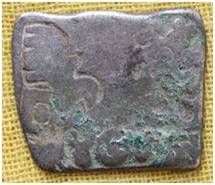 | Description / विवरण | The shape of the coin is rectangular. Obverse Animal figure, six armed wheel and some indistinct symbols. Reverse Indistinct symbols. |