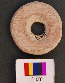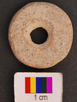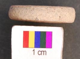 | Description / विवरण | It is a small circular terracotta disc with a perforation in the central part. The perforation has damru shaped section. The edge of the disc as well as perforation has use marks. Perhaps it was used as a net sinker. |