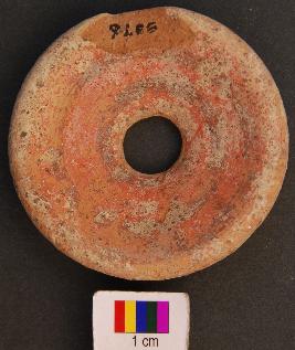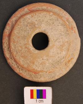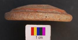 | Description / विवरण | It is a lamp like object, the inner wall of which is decorated with black paintings. It has a perforation in the center. The base stem part of which is missing. |