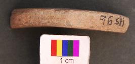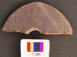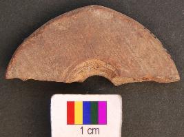 | Description / विवरण | It is fragment of a terracotta wheel. Its other half is missing. It has a damru shaped perforation. |