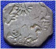 | Description / विवरण | The coin is an imperial type Punch- marked coin. The shape of the coin is octagonal. Obverse Sun, deer, humped bull, six armed wheel and some indistinct symbols. Reverse Indistinct symbols. |
