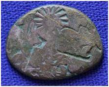 | Description / विवरण | The coin is an imperial type Punch- marked coin. The shape of the coin is irregular. Obverse Sun, deer, animal figure and an indistinct symbol. Reverse Two indistinct symbols. |