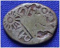 | Description / विवरण | The coin is an imperial type Punch- marked coin. The shape of the coin is oval. Obverse Sun, six armed wheel, three arched gate and two indistinct symbols. Reverse Four nandipada around a dot and two indistinct symbols. |