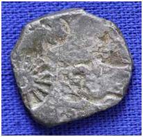 | Description / विवरण | The coin is an imperial type Punch- marked coin. The shape of the coin is irregular. Obverse Sun and other symbols are indistinct due to abrasion. Reverse Three arched mountain with a crescent at the top. |