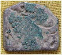 | Description / विवरण | The shape of the coin is square. Obverse A Sun, A swan, three arch mountains, a tree and middle portion not visible due to silver sulphite formation. Reverse Symbols are not visible due to silver sulphite formation. |