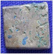 | Description / विवरण | The shape of the coin is square. Obverse A Sun, an indistinct symbol within a square box, three dots with three circle and other symbols are not clear due to abrasion. Reverse Blank. |
