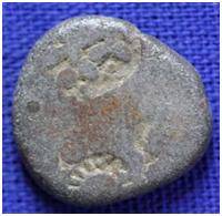 | Description / विवरण | The shape of the coin is irregular. Obverse human figure, Sun within a half circle, caduceus. Reverse Blank. |