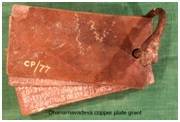 | Description / विवरण | A set of three inscribed copper plates attached to a ring with a royal seal. The seal is in the form of a couchant bull with a lotus flower. There are altogether 45lines of writings. The language of the inscription is sanskrit and the script is south Indian type. |