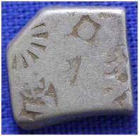 | Description / विवरण | The coin was imperial type of punch marked coin. The coin is irregular in shape. Obverse A star within a circle, a half portion of a chakra, a dot within a square, a dot on the middle of a crescent and a tree. Reverse taurine symbol. |
