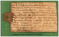 | Description / विवरण | This is single plate copper plate grant. A semi circular head is attached to the left which contains a circular hole. The obverse contains 11 lines and the reverse 7 lines of writing. The language is Sanskrit the script is Gupta Brahmi. The plate records that the grant of the village in sare phara is given in favour of Brahmanas named Dhruvamitrasvamin and others. |