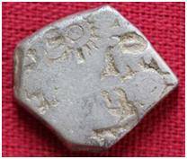 | Description / विवरण | The coin was imperial type of punch marked coin. The coin is irregular in shape. Obverse six armed wheel wheel, Sun and an indistinct symbol. Reverse dot within a circle, chakra. |