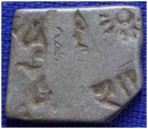| Description / विवरण | The coin was imperial type of punch marked coin. The coin is pentagonal in shape. Obverse Chakra, taurines, six armed wheel wheel, fish, two stupas like object at little distance from each other with two flag. Reverse Blank. |