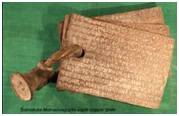| Description / विवरण | Three plates are attached to a ring. The first side of the first plate and second side of the third plate are left blank. Altogether 50 lines of writing. The seal is not clear. The language of writing is Sanskrit the Script is Proto-nagari. The plates record the gift of the village Nibinna in the Kosala Country, to the Dikshita Pundarika Serman. |
