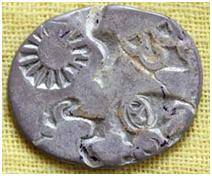 | Description / विवरण | The coin is an imperial type punch marked coin. The shape of the coin is oval. Obverse three arched mountain, six armed wheel wheel, rhinoceros, chakra. Reverse Two Nandipada. |