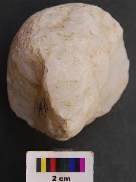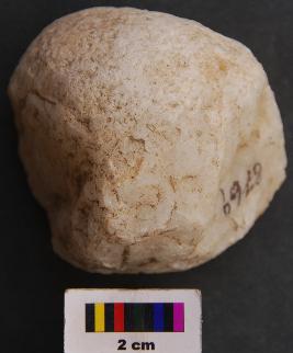 | Description / विवरण | It is a hammer stone the surface of which has pecking marks and has circular body. It is partially broken. |