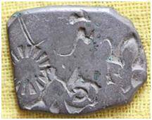 | Description / विवरण | The coin is an imperial type of Punch- marked coin. The shape of the coin is irregular. Obverse six armed wheel wheel, Sun, indistinct symbol. Reverse tree. |