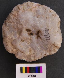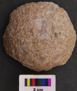| Description / विवरण | It is fragment of a hammer stone the surface of which has pecking marks and has circular body. |