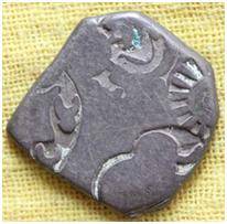 | Description / विवरण | The coin is an imperial type of Punch- marked coin. The shape of the coin is irregular. Obverse Sun, six armed wheel, animal, two taurines back to back and an indistinct symbol. Reverse Blank. |