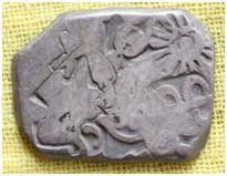 | Description / विवरण | The coin is an imperial type of Punch- marked coin. The shape of the coin is irregular. Obverse chakra, caduceus, dog, heron. Reverse Three arched hill with crescent at the top. |
