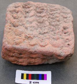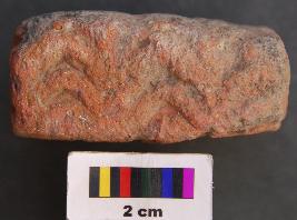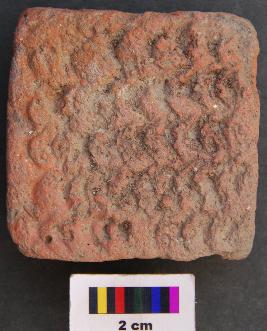 | Description / विवरण | It is a squarish terracotta object, the frontal and dorsal surface of which has deep incised wavy decoration. It looks like a skin rubber. It may also be used as a stamp. Its reverse part is broken. |