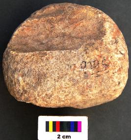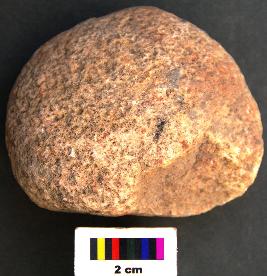 | Description / विवरण | It is a hammer stone with round body and partially broken surface. It has pecking marks on the surface. |