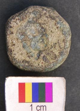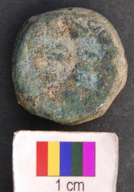 | Description / विवरण | It is a circular copper coin with very thick section. Its edge has evidence of beaten surface. Due to leaching out of copper sulphate it is difficult to understand motifs on its surface. |