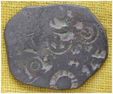 | Description / विवरण | The shape of the coin is irregular. Obverse six armed wheel, chakra, caduceus, tree, rhinoceros, Sun. Reverse taurine, a dot within a circle, six armed wheel. |