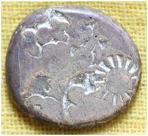 | Description / विवरण | The coin is an imperial type punch marked coin. The shape of the coin is circular. Obverse Sun, six armed wheel and other symbols are indistinct. Reverse Symbols are indistinct. |