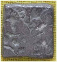 | Description / विवरण | The shape of the coin is square. Obverse crescent topped three arched hill, rabbit, six armed wheel, chakra. Reverse Sumbols are not clear. |