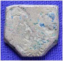 | Description / विवरण | The shape of the coin is hexagonal. Obverse Sun and other symbols are indistinct due to abrasion. Reverse Symbols are indistinct due to abrasion. |