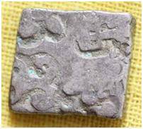 | Description / विवरण | The coin is an imperial type of Punch-marked coin. The coin is rectangular in shape. Obverse Sun, six armed wheel, Srivatsa, six armed wheel and other symbols are indistinct. Reverse Ujjayini and an indistinct symbol. |