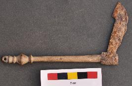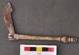 | Description / विवरण | It is an interesting object made of brass to which a an iron sheet is attached. This sheet of iron is slightly curved on frontal part and has circular hole on the rear end. To this hole is attached a brass rod. The thickness of brass rod gradually decreases towards the other end. It has series of beautiful elevated rings at the end point besides a thin perforation. It looks like a flag. |